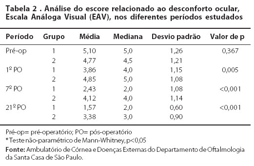 Sabemos que a avaliação do desconforto ocular por meio do questionário de escala análoga não é isenta de viés, principalmente pela subjetividade dos sintomas, com diferenças pessoais no julgamento de diferentes estímulos; entretanto, em nosso estudo, todos os pacientes receberam as mesmas orientações pré e pós-operatórias, dadas pelo mesmo médico, sem distinção entre os diferentes tipos de tratamento. O menor escore da Escala Análoga Visual (EAV) encontrado no grupo 1, traduz o menor desconforto ocular encontrado em todos os períodos estudados. Resultados similares foram encontrado em outros estudos(1,4,19).