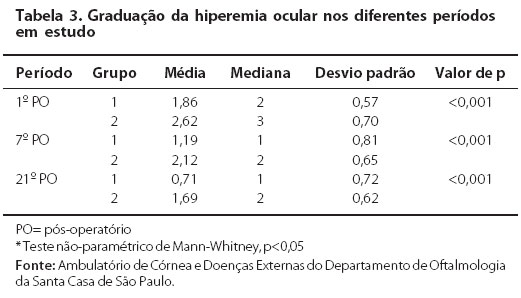 A hiperemia ocular no grupo 1 foi menor em todo período pósoperatório estudado (Tabela 3, Figura 1). Verificou-se que também a hiperemia ocular no grupo 1 no 1º dia PO foi semelhante ao 7º (p=0,205) e ao dia 21º PO no grupo 2 (p=0,477).