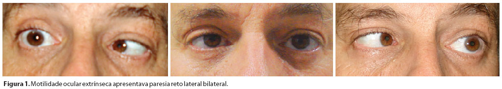 Ao exame oftalmológico inicial apresentava acuidade visual 1,0 (na escala decimal) em AO. Ao exame da motilidade ocular extrínseca havia paresia do músculo reto lateral bilateralmente, mais acentuada à direita (Figura 1) e os demais músculos apresentavam função normal. A sensibilidade corneana e da fronte estavam reduzidas à direita ao exame com monofilamento. A biomicroscopia do segmento anterior, a exoftalmometria com exoftalmômetro de Hertel, os reflexos pupilares e a fundoscopia foram normais em AO.