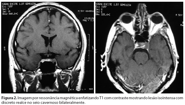 Aos exames laboratoriais, verificou-se leucopenia (2.500 leucócitos,com 46% de neutrófilos e 42% de linfócitos), acometimento renal (creatinina: 4,0 mg/dl e uréia: 69 mg/dl) e hepático (TGP: 130 U/L, fosfatase alcalina: 376 UI e gama GT: 452 UI) e hipoproteinemia (proteínas totais: 4,8 g/dl, albumina: 2,1 g/dl e globulinas 2,7 g/dl). A imagem por ressonância magnética (IRM) enfatizando T1 evidenciou lesão isointensa, com discreto realce após administração de gadolínio localizada em ambos os seios cavernosos, mais evidente à esquerda (Figura 2). Devido à suspeita de lesão neoplásica, foi realizado estudo histopatológico da lesão axilar que evidenciou hiperplasia linfóide atípica e a biópsia da medula óssea evidenciou infiltração de células linfóides fortemente sugestiva de linfoma não-Hodgkin. Algumas semanas após o diagnóstico, o paciente desenvolveu falência renal e hepática.