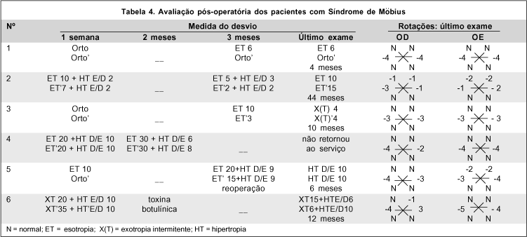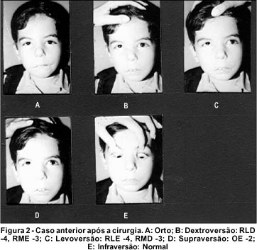 O plano cirúrgico consistiu de recuo isolado de retos mediais em 3 pacientes e foi associado em 2 casos à ressecção de um reto lateral e em 1 caso à ressecção de um reto inferior. A amplitude dos retrocessos variou de 4 a 6,5 mm e das ressecções de 10 a 11 mm (valores não aconselhados mais). Em 1 paciente foram realizados recuo-ressecão monoculares e apenas um não foi operado (Tabela 3). No pós-operatório de 1 semana houve 2 casos de ortotropia (Figura 2), 2 casos de esotropia de 10 DP, um deles com microhipertropia à esquerda, 1 caso de esotropia de 20 DP associado a hipertropia direita de 10 DP e 1 paciente apresentou exotropia de 20 DP acompanhada de hipertropia esquerda de 10 DP. Ao final de 3 meses, houve ótimo resultado em 3 pacientes e esotropia residual de 20 DP em 2 casos, dos quais um foi reoperado com bom resultado e o outro não voltou mais ao serviço. Em 1 paciente houve exotropia secundária de 20 DP, sendo submetido a 2 aplicações de toxina botulínica (5 U em cada reto lateral) com melhora razoável, retornando ao serviço após 1 mês com exotropia de 15 DP (Tabela 4).
