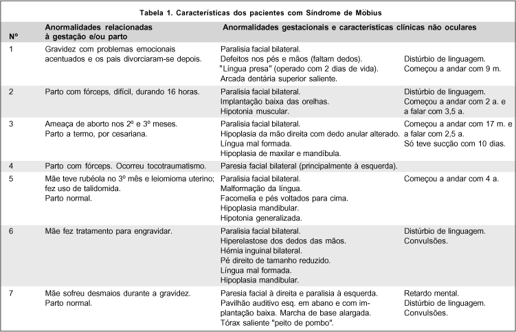 Alteração da mímica facial e paresia ou paralisia do nervo abducente ocorreram em todas as crianças. Defeitos das extremidades, distrofia da língua, anormalidades maxilo-mandibulares e distúrbios da fala apareceram em 4 casos. Houve também atraso em iniciar a deambulação em 3, implantação baixa e saliente do pavilhão auditivo e convulsões em 2, e hérnia inguinal e malformação óssea do tórax em 1 paciente (Tabela 1).