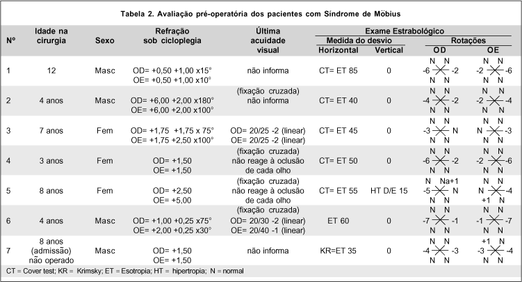 Todos os pacientes apresentaram hipermetropia variando de +0,50 a +6,00 dioptrias, associada ou não a astigmatismo, mostrando um equivalente esférico de +1,00 a + 4,00 (média = +2,7). O paciente n° 5 apresentou aniso-hipermetropia (de 2,5 dioptrias). Fixação cruzada foi observada em quatro dos sete casos. A esotropia apareceu em todos os casos, variando de 35 a 85 dioptrias prismáticas (média de 52,9). Somente o paciente n° 5 apresentou hipertropia, de 15 DP. A limitação de abdução, simétrica em 6 casos, variou de -3 a -7; dois pacientes apresentaram "olhos congelados" em convergência. A adução foi normal em dois pacientes e deficiente em 5, variando de -1 a -3. Os movimentos verticais foram normais (Tabela 2).