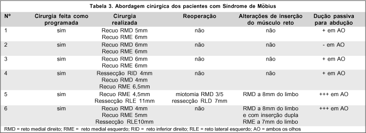 Os autores acreditam que, realmente os 3 pacientes com melhores resultados cirúrgicos foram aqueles submetidos a retrocesso bimedial. Os pacientes submetidos a retrocesso-resecção apresentaram os piores resultados. Devido à grande contratura dos retos mediais, o seu enfraquecimento deve ser menor do que em casos de paralisia isolada de abducentes de mesmo valor. O retrocesso dos retos mediais já deficientes, piora a adução, sendo o resultado ideal, possível, uma micro-esotropia com olhos congelados horizontalmente. Os movimentos oculares verticais geralmente permanecem normais. A injeção de toxina botulínica aplicada em apenas 1 caso, produziu melhora razoável, mas não parece estar indicada em pacientes com Síndrome de Möbius.