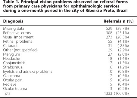 Impaired vision was chosen as the major theme here because we observed that a considerable portion of the cases referred for ophthalmology consults were in patients who presented with refractive errors or with some degree of undiagnosed impaired vision, both of which are frequently associated with blurred vision(14). In our region, forms that are missing data might account for many of the difficulties encountered by primary health care physicians in understanding ocular conditions. It is likely that many of these forms were related to patients with some kind of impaired vision. These difficulties might be associated with a lack of knowledge and experience in ophthalmology on the part of general practitioners, which probably dates back to their university education. However, the present CRP, which was based on simple ophthalmologic details, could help general practitioners in solving ocular problems adequately through the health care system.