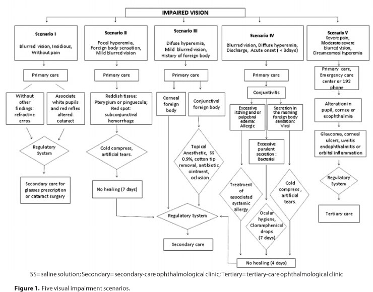 Impaired or blurred vision, in one or both eyes, should be preferentially measured using a logMAR chart (visual acuity of a normal eye was then recorded as decimals, for example, 1.0). Normal visual acuity can vary according to patient age, as follows: 6 months to 2 years - fixate and maintain steady fixation on light and objects; 2 to 5 years - 0.5 or better; and older than 5 years - 0.7 or better and a difference of less than two lines between eyes. Patients who do not reach these levels of visual acuity are classified as having impaired vision. The findings of the clinical history, examination parameters and results of visual acuity measurement, should all be addressed on the referral form, together with individual patient data, prior to the proposal of diagnoses. The RS team uses these forms to refer patients to a higher level of the SUS for an ophthalmologic consultation.