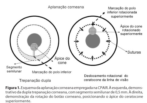 Após anestesia peribulbar, foram realizadas duas trepanações coincidentes superiormente e com diferença de 0,5 mm inferiormente, o que permitiu a ressecção de um segmento corneano, em forma de crescente, na região inferior mais próxima ao afinamento, com a finalidade de promover maior aplanação do disco corneano. Foi realizada rotação do disco corneano a 180° deslocando o ápice do cone para a região superior e a região mais espessa da córnea, para o eixo visual. O botão foi suturado utilizando fio mononylon 10.0 com 24 pontos diametralmente separados. Ao final da cirurgia, foi realizada ceratoscopia com disco de Plácido e substituição dos pontos frouxos ou apertados (Figura 1).
