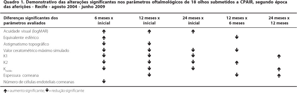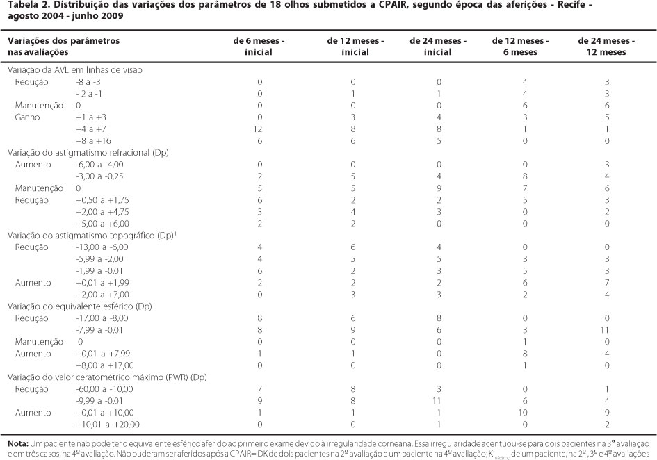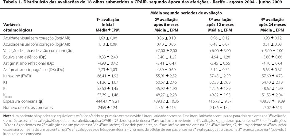 Na tabela 1, estão expressas as avaliações médias iniciais e decorridos seis, 12 e 24 meses da CPAIR, constatando-se melhora da acuidade visual (expressa em logMAR), ganho de linhas de visão, melhora do equivalente esférico, diminuição do astigmatismo topográfico e das curvaturas corneanas máxima e média, assim como adelgaçamento corneano. Também se verificou diminuição do número de células endoteliais corneanas, decorridos seis, 12 e 24 meses da CPAIR, quando comparado ao inicial.