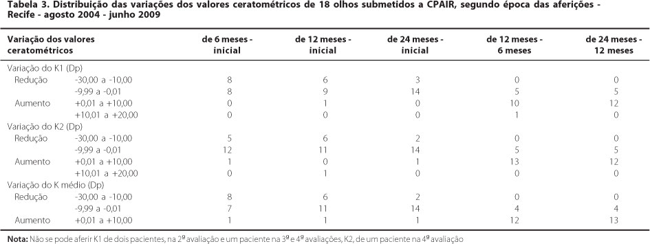 Em relação aos parâmetros ceratométricos, conforme apresentado na Tabela 3, mais frequentemente se observou redução em porcentuais próximos ou iguais a 100% dos olhos, nas três avaliações, quando comparadas à aferição pré-operatória, em valores variando de -30,00 a -0,01. Todas essas diferenças alcançaram significância estatística. Apesar disso, quando se determinaram as variações de uma avaliação para outra, constatou-se aumento gradual desses valores. Da comparação entre a aferição após 12 meses com aquela realizada após seis meses da CPAIR, observou-se que em 11 dos 16 olhos aferidos (68,8%) houve aumento de K1, o qual se manteve na comparação feita entre esta e a avaliação subsequente. Comportamento semelhante foi verificado para a aferição de K2. Foram significantes as variações de K1 e Kmédio entre seis meses e 12 meses, enquanto que a variação de K2 foi significante no período entre 12 e 24 meses (Tabela 3).