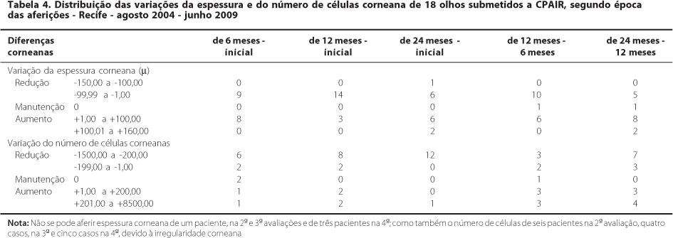Foram significantes as reduções da espessura corneana ocorridas após 12 meses da cirurgia, quando comparadas aos valores iniciais e depois de seis meses da CPAIR, assim como foi significante o aumento da espessura que se verificou após 24 meses, quando comparada àquela dos 12 meses, como demonstrado nas tabelas 1 e 4. Decorridos seis meses da cirurgia, oito dos 17 olhos (47%) tinham aumento da espessura corneana, mas, após 12 meses, esse porcentual reduziu-se a 17,6%, voltando a alcançar o mesmo porcentual de 47%, na comparação entre a terceira e a quarta avaliações.