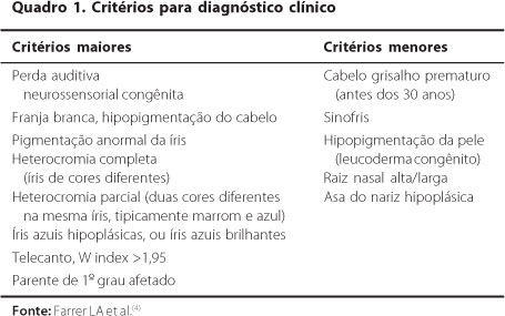 O diagnóstico é clínico, sendo necessários dois critérios maiores ou um maior e dois menores(4) (Quadro 1). Mais de 90% dos indivíduos com critérios diagnósticos para SW tipo I possuem mutações identificáveis no gene PAX3(5). Este é o único gene conhecido associado à síndrome, sendo, portanto, usado no aconselhamento genético.