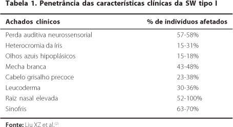 A síndrome de Waardenburg (SW) foi inicialmente descrita em 1951 por P. J. Waardenburg, como uma condição autossômica domi-nante que apresenta penetrância (Tabela 1) e expressividade variáveis de seus caracteres. Os sinais clínicos mais frequentes são: deslocamento lateral dos cantos internos dos olhos (telecanto), hiperplasia da porção medial dos supercílios (sinofris), base nasal proeminente e alargada, alterações na pigmentação da íris e da pele, surdez congênita, mecha branca frontal ou encanecimento precoce(1).