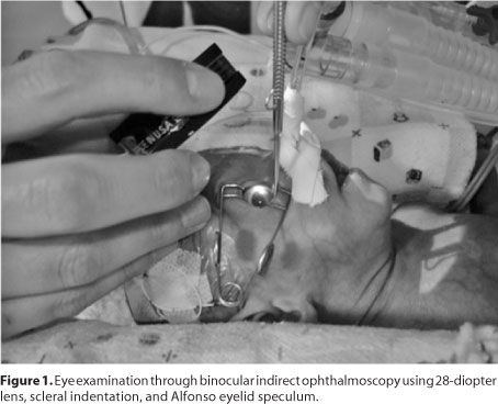 Fundus examination in VLBW preterm infants is technically difficult to perform, requiring previous training and experience and adequate support from the nursing staff due to the poor health status of the preterm infants. In several occasions, examinations involve patients on ventilatory support with unstable vital signs, who are more prone to side effects of mydriatic eyedrops and to eye manipulations by the ophthalmologist. Therefore, the presence of the nursing staff throughout the procedure is extremely important in order to control and maintain an open airway, to monitor the infant's vital signs and behavior, and to avoid life-threatening conditions(21).