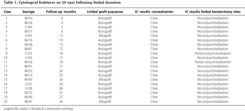 MÉTODOS: Vinte pacientes doadores de tecido límbico foram avaliados (17 para transplante autólogo e 3 para alógeno). Os exames citológicos foram realizados em dois momentos: antes da ceratectomia, que removeu tecido límbico dos quadrantes superior e inferior, e após o terceiro mês pós-operatório.