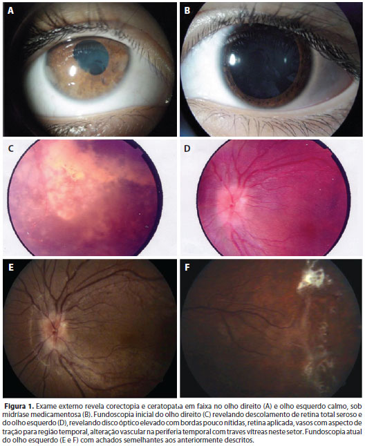 Ao exame, apresentava AV de sem percepção luminosa (SPL) no OD e de 20/125 (refração: -1,75DE // -2,00DCx170º) no OE; exotropia preferindo OE; microftalmia do OD, além de nistagmo com aumento de frequência/amplitude às dextro/levoversões. À biomicroscopia do OD apresentava: ceratopatia em faixa, câmara anterior sem reação, corectopia, sem rubeosis iridis. Apresentava pressão intraocular de 4 mmHg (OD) e de 16 mmHg no OE. A fundoscopia do OD revelava descolamento de retina (DR) total seroso e o OE mostrava disco óptico elevado com bordas pouco nítidas, retina aplicada, vasos com aspecto de tração para região temporal, alteração vascular na periferia temporal com traves vítreas neste setor (Figura 1).