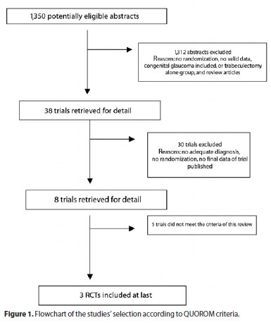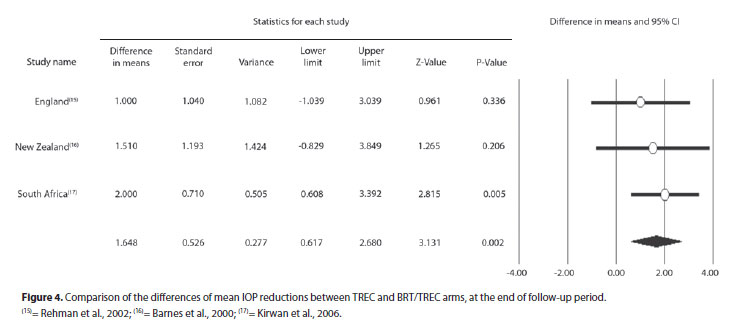 RESULTADOS: De um total de 1.350 citações, oito estudos (cinco coortes e três aleatorizados) foram identificados e apenas 3 RCT foram incluídos nesta meta-análise. Maiores reduções na PIO foram verificadas no braço de estudo da BRT, comparado com o braço controle (diferença média=1,68 mmHg, 95% CI= 0,61-2,68, P=0,002). A frequência de PIO pós-operatória não controlada (>21 mmHg) foi menor quando utilizada a BRT (BRT/TREC) em relação ao grupo controle (38/218 =17,4% versus 9/239 =3,8%; OR= 6,7 IC 95% 3,2 14,3, P<0,0001). Apesar do melhor controle da PIO ter sido observada em todos os pacientes do braço BRT, apenas os pacientes negros apresentaram uma diferença significativa (P=0,005). Não houve diferenças significativas entre os braços BRT e controle, em termos de perda da acuidade visual, complicações pós-operatórias e necessidade de cirurgia de catarata.