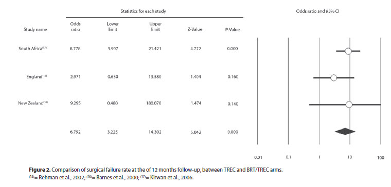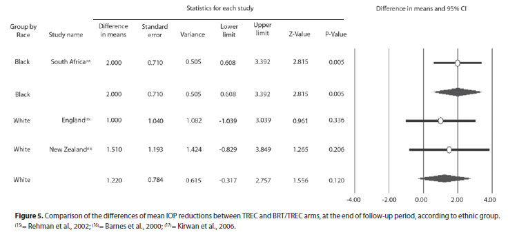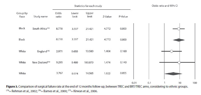 In our analysis, a significant IOP reduction was observed in Black patients (P=0.005), however there is only a trend towards a significant difference for the IOP control in the Caucasian patients treated by BRT (P=0.05). Although Black patients have shown an aggressive healing response(31), this difference could be explained by sample size of these trials, instead of a real difference due to ethnic subgroups. The necessary statistic power for these two studies(15,16) able to detect a 10% (postulated) difference in the primary outcome, considering the confidence intervals of 95%, was around 20-25%. In this way, the small number of participants in these studies may compromise the presented statistical analysis. For example, in order to detect a 10% reduction in TREC failure, more than 250 surgeries would be required. Thus, further RCT with an enough sample size should be performed to evaluate the benefits of the BRT in Caucasian patients.