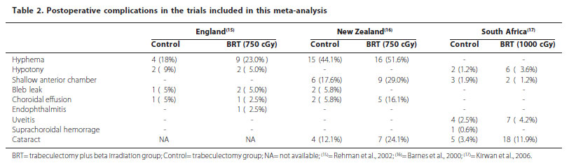 RESULTS: Of a total of 1,350 citations, eight studies (five cohorts, three randomized) were identified and only 3 RCT were included in this meta-analysis. Higher IOP reductions were verified in the BRT arm compared to the control arm (mean difference=1.68 mmHg, 95% CI= 0.61-2.68, P=0.002). Uncontrolled postoperative IOP (>21 mmHg) was less frequent when BRT was used (BRT/ TREC arm) compared to the control arm (38/218=17.4% versus 9/239=3.8%; OR=6.7; 95% CI 3.2-14.3, P<0.0001). Although better IOP control was observed in all patients treated with adjuvant BRT, only Black patients displayed a significant difference (P=0.005). There were no significant differences between the BRT and control arms regarding loss of visual acuity, postoperative complications and necessity of cataract surgery.