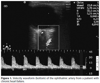 This study evaluated the ophthalmic artery blood flow in patients with heart failure. No similar study was found in the literature regarding this form of evaluation. Low cardiac output is associated with compensatory mechanisms of peripheral vasoconstriction in attempt to maintain satisfactory blood pressure and minimum perfusion to critical tissues such as the heart and brain(17,26). On the other hand, the excessive vasospasm/vasoconstriction of the ocular vessels may be related to a reduction in the perfusion and tissue death at the optic nerve head(6). Therefore, patients with CHF could present hemodynamic alterations of the ocular microvasculature and a higher risk of developing glaucoma. The color Doppler imaging of the ophthalmic artery with the velocity waveform in function of the heart cycle offers important information regarding hemodynamic pathophysiology.