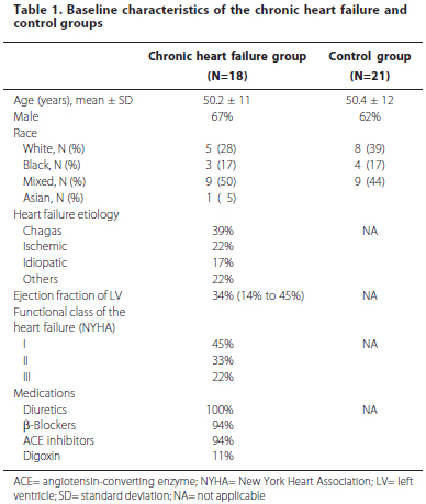 A cross-sectional study was carried out. Patients with heart failure symptoms and left ventricle ejection fraction bellow 55% documented by echocardiography were recruited from the outpatient cardiomyopathy and heart failure clinic of a tertiary care university hospital. Non-cardiopathic volunteers were included as a control group. The study was approved by the Institutional Review Board and followed the tenets of the Declaration of Helsinki. Informed consent was obtained from all subjects prior to the study and after an explanation of the nature and possible consequences of the study.