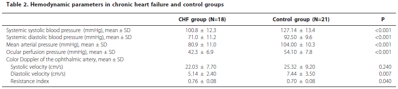 Results: Mean diastolic velocity was 5.14 ± 2.4 cm/s in the chronic heart failure group and 7.44 ± 3.5 cm/s in the control group (p=0.007). Mean resistance index of the ophthalmic artery was 0.76 ± 0.08 in the chronic heart failure group and 0.70 ± 0.08 in the control group (p=0.04). Mean systolic velocity of the ophthalmic artery was 22.03 ± 7.7 cm/s in the chronic heart failure group and 25.32 ± 9.2 cm/s in the control group (p=0.24). There was a negative correlation between the resistance index of the ophthalmic artery and systemic blood pressure of patients with chronic heart failure (r= -0.47, p=0.007). Diastolic velocity of the ophthalmic artery correlated positively with systemic blood pressure (r=0.44, p=0.02).