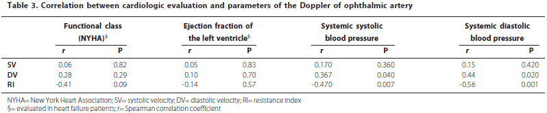 The correlations between the color Doppler ultrasound indices and left ventricle ejection fraction, functional classification (New York Heart Association - NYHA) and the measurements of blood pressure were calculated using the Spearman correlation test. To take into account the correlation between both eyes of the same individual, generalized estimating equation was used to compare the mean values between the groups. It was calculated that at least 36 eyes in each group were needed to have 90% power to detect a 0.1 difference in the resistance index between the groups, considering a standard deviation of 0.1, an intracluster correlation between both eyes of the same individual of 0.58, a design effect of 1.58 and a significance level of 0.05. Results are expressed as mean ± standard deviation (SD), and P<0.05 was considered statistically significant.