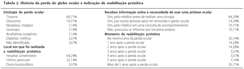 A tabela 2 apresenta os dados relacionados à história da perda do globo ocular e da reparação protética. O trauma foi o fator etiológico prevalente (60,71%), seguido do glaucoma (10,71%), anoftalmia congênita (7,14%), neoplasia maligna (7,14%), sarampo (7,14%), diabetes mellitus (3,57%) e causa não identificada (3,57%). A ausência do globo ocular foi identificada mais frequentemente no lado esquerdo da face (71,43%). A maioria dos pacientes (82,14%) realizou um ou mais procedimentos cirúrgicos no globo ocular. A maior parte dos sujeitos da pesquisa (89,29%) relatou ter recebido informações sobre a possibilidade de perda ocular, sendo que 64,29% foram informados no momento da cirurgia sobre a necessidade de usar uma prótese. Para 35,71% a prótese foi adaptada depois de mais de cinco anos da perda. A reparação protética foi realizada principalmente em instituições públicas (67,86%).