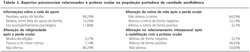 A tabela 3 apresenta os dados quantitativos relacionados às implicações psicossociais e à prótese. A maior parte da população estudada recebeu apoio da família (89,29%). Apenas cinco pacientes receberam acompanhamento psicológico após a perda do globo ocular, sete pacientes consideraram esse acompanhamento um importante auxílio para a adaptação de pessoas com anoftalmia congênita ou que perderam o globo ocular. Metade da amostra não considerou a prótese como instrumento de modificação do seu relacionamento interpessoal, sendo que 46,43% observaram modificações positivas. Para 32,14% a perda ocular repercutiu de forma negativa na rotina de vida. Quanto à religiosidade o fato de ter perdido ou não ter o globo ocular não alterou a religiosidade de 89,29% dos participantes, dois participantes passaram e ter maior crença e apenas um mudou de religião.