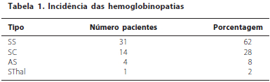 Foram estudados 50 pacientes (100 olhos). Dos pacientes estudados 28 eram do sexo masculino (56%). O tipo de hemoglobinopatia mais encontrada foi a do tipo SS com 31 pacientes (62%), seguida pela hemoglobinopatia SC com 14 pacientes (28%), AS com 4 pacientes (10%) e Sthal com 1 paciente (2%). Dentro da amostra estudada, 11 pacientes (22%) apresentaram alterações retinianas. Destes 8 eram do sexo masculino (73%) e 3 do sexo feminino (27%) (Tabela 1).