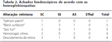 Alterações retinianas foram diagnosticadas em 3 pacientes com o tipo SS, em 5 pacientes portadores do tipo SC e em 3 dos pacientes portadores do tipo AS. As alterações retinianas encontradas foram: hemorragias pré-retinianas do tipo "salmon patch" em 1 paciente (1 olho); "black sunburst" em 5 pacientes (7 olhos); "sea fan" presente em 3 pacientes (4 olhos); hemorragia vítrea em 4 pacientes (4 olhos) e descolamento de retina em 4 pacientes (4 olhos). Dois pacientes (2 olhos) do grupo SC apresentaram história pregressa de vitrectomia via pars plana para HV e DR. Os achados divididos nos respectivos grupos encontram-se listados na tabela 2.