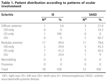 CONCLUSION: Prevalence of unilateral nodular scleritis was noted in both groups and higher rates of all the parameters tested were noted in the scleritis associated with systemic rheumatoid disease group. There were no differences between the groups with respect to the use of immunosuppressive drugs and therapeutic response, which was fully satisfactory in the scleritis associated with systemic rheumatoid disease group and satisfactory in the isolated scleritis group.