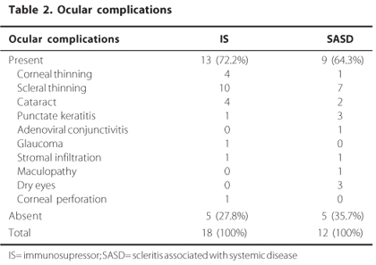 In the IS group, 72.2% presented ocular complications and in the SASD group, 64.3%; however this difference did not show statistical significance. Scleral thinning prevailed in both groups, which is in accordance with previous studies in literature(3). In our study, all the cases of cataract were caused by de use of corticoids and the cases of corneal perforation were related to corneal melting.