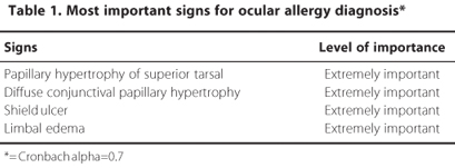The panel members agreed that anamnesis, slit-lamp examination and fluorescein staining are important diagnostic measures to detect the ocular surface allergic disease (X2calc < X20.05). There was also consensus about the importance of signs and symptoms to the diagnosis (Table 1; Table 2).