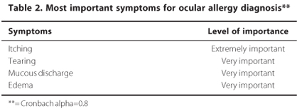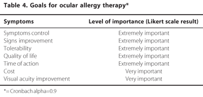 The panelists were questioned on the following goals for the ocular allergy therapy: control of signs and symptoms and tolerability to medications. The degree of importance agreed among the panelist is presented on table 4.
