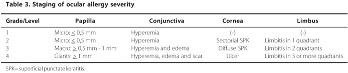Consensus was reached on the significance of establishing a staging of ocular allergic diseases based on levels of severity. Such staging would allow appropriated evaluation of progression, the establishment of algorithms of treatment, as well as objective assessment in clinical trials for analysis of treatment efficacy(5).
