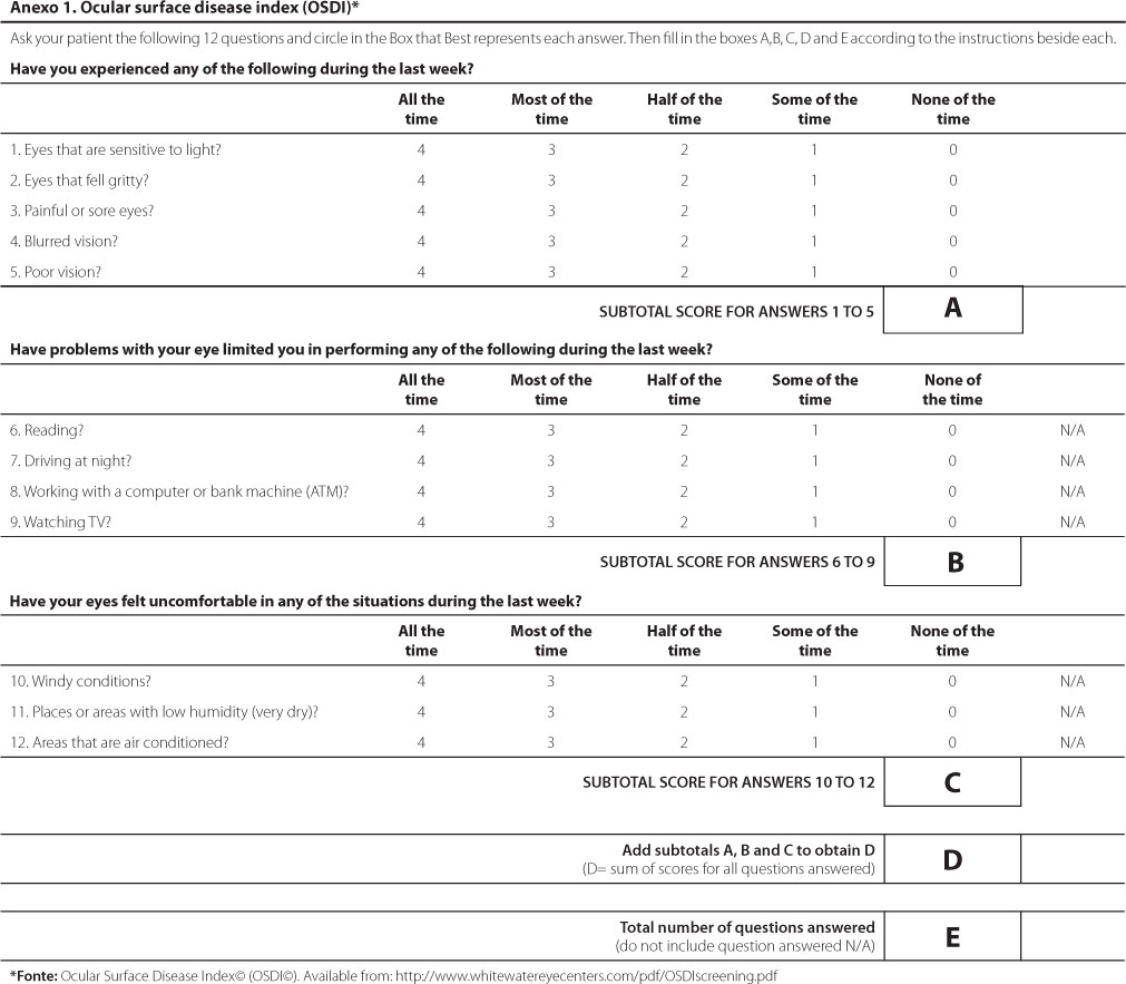O OSDI é um questionário que foi gerado de observações feitas por pacientes em estudos conduzidos pela Allergan Inc, de sugestões de vários pesquisadores e de dados de outros instrumentos de medidas de qualidade de vida(8). Tem sido considerado um instrumento válido e fiel na medida da gravidade do olho seco e de seus efeitos sobre a visão do paciente(8). O OSDI avalia o olho seco quantitativamente, de uma maneira simples, rápida e eficaz, com um custo baixo e sem a necessidade de exames complementares. Além disso, não depende da etiologia da secura ocular, podendo ser aplicado em várias situações. Sendo simples e de fácil manejo pode ser utilizado por todos os médicos, de qualquer área de atuação. Pode ser dividido em três subescalas: a primeira relacionada à função visual (perguntas de 1 até 5), a segunda associada a sintomas oculares (perguntas de 6 até 9) e a terceira, com desencadeantes ambientais (perguntas 10, 11 e 12).