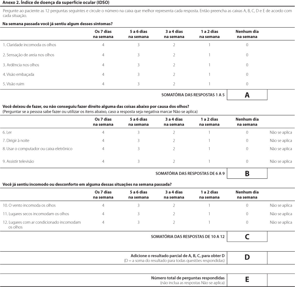 Concluindo, pode-se dizer que a atual versão apresentada do OSDI encontra-se validada para uso em língua portuguesa. Tal versão demonstrou bons índices de concordância intra e interobservador. O questionário OSDI adaptado à população brasileira, é um método confiável que não depende de um entrevistador único, podendo ser aplicado por todos os profissionais da saúde, como método de triagem e acompanhamento terapêutico.