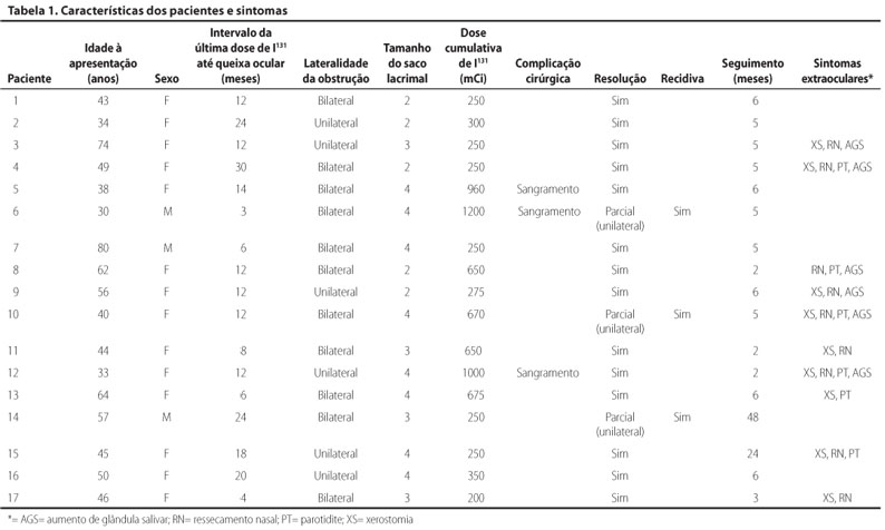 Todos os pacientes apresentaram obstrução lacrimal instalada no nível do ducto nasolacrimal, logo abaixo do saco lacrimal, comprovada por sondagem, irrigação e dacriocistografia; em 64,7% dos pacientes (11 indivíduos) a obstrução de vias lacrimais foi bilateral. Quanto ao tamanho do saco lacrimal, houve variação de grau 2 a 4, com 47% dos pacientes (8 indivíduos) apresentando saco lacrimal classificado como grau 4. Todos os pacientes foram submetidos à dacriocistorrinostomia externa com intubação do ducto nasolacrimal com silicone (Sonda de Crawford, FCI, França) com resolução total da obstrução em 82,4% dos pacientes (14 indivíduos) e parcial em 17,6% (três indivíduos), que apresentaram recidiva unilateral após correção bilateral da obstrução. O tempo de recidiva foi de cinco meses em dois pacientes, sendo um paciente que apresentou sangramento intraoperatório aumentado e dose cumulativa de 1200 mCi, e um paciente com dose cumulativa de 670 mCi. O terceiro paciente apresentou recidiva 48 meses após a cirurgia, tendo recebido dose cumulativa de 250 mCi. O tempo médio de seguimento foi 6 meses, variando de 2 a 24 meses. Observou-se também dilatação de saco lacrimal (grau 4) e sangramento intraoperatório aumentado em três pacientes mais jovens, com dose cumulativa média de radioiodo igual a 1053 mCi; casos 5, 6 e 12 (respectivamente com 38, 30 e 33 anos de idade) (vide Tabela 1).