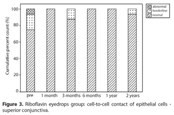 RESULTADOS: Pacientes do grupo "cross-linking" apresentaram melhora na adesividade das células epiteliais e proporção núcleo: citoplasma na conjuntiva temporal após o tratamento (P=0,008 e P=0,047), respectivamente. Na conjuntiva superior, houve um aumento na densidade das células caliciformes (P=0,037) e nível de organização da cromatina nuclear (P=0,010) após o tratamento. Pacientes do grupo colírio de riboflavina apresentaram melhora na adesividade das células epiteliais na conjuntiva superior após o tratamento (P=0,021). Na conjuntiva temporal, houve melhora na adesividade das células epiteliais (P<0,001), aumento na proporção núcleo: citoplasma (P<0,001), células caliciformes (P=0,001) e menor queratinização (P=0,011). Ambos os grupos não apresentaram alterações corneanas. O Teste exato de Fisher para comparação de citologia de impressão no escore total após o tratamento não revelou diferença entre os grupos.