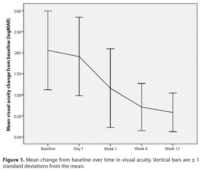 Improvement in visual acuity was achieved in all patients of our series, mean VA improved from 2.06 ± 0.94 logMAR before surgery to 1.91 ± 0.93, 1.16 ± 0.94, 0.71 ± 0.56 and 0.58 ± 0.46 logMAR, respectively at day 1, week 1, week 4 and week 12 (Figure 1).