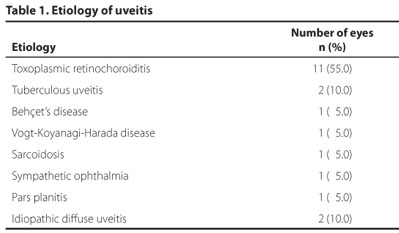 Surgeries were performed after the inflammation was controlled by medical treatment and all patients had quiescent uveitis for at least 3 months. Eyes with previous vitreoretinal surgery or retinal detachment were not included in this study. Diagnostic evaluation included a full medical history, clinical evaluation, and appropriate laboratory investigation.