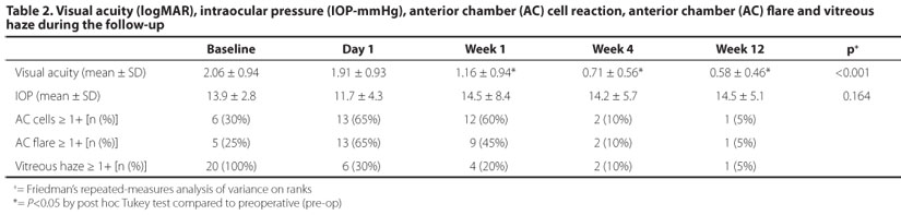 No case of infective endophthalmitis occurred. Postoperative hypotony was seen in three eyes and was associated with peripheral choroidal detachment in two eyes. Secondary cataract progression occurred in three eyes in our series (20.0% of the phakic eyes) during the follow-up period and phacoemulsification with intraocular lens implantation was performed in two of them before the final visit. One eye that underwent subtenon injection of triamcinolone acetonide experienced an IOP elevation with poor response to appropriate clinical therapy and was further referred to glaucoma filtering surgery. One patient with toxoplasmic retinochoroiditis had a relapse during the second month of follow-up and was successfully treated with trimethoprim/sulfamethoxazole associated with systemic prednisone. His visual acuity at the last visit (week 12) was 0.50 logMAR.