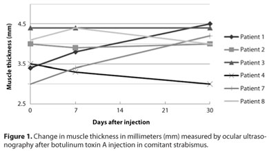 METHODS: Eight patients (five female) were enrolled to measure ocular motility prior and 1, 7, 30 and 180 days after one injection of 2 ml of 1.5% bupivacaine and 2.5 U of botulinum toxin A in agonist and antagonist muscles, respectively, of eight amblyopic eyes. Muscle thickness was measured prior and on days 1, 7 and 30 after injection using 10-MHz ultrasonography (eyelid technique).