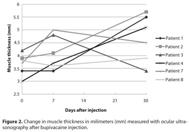 In the present series, there was an increase in muscle thickness for both groups, injected with botulinum toxin A and bupivacaine, but the second group presented a greater amount of response. Previous studies showed increase in muscle volume after 33 days(11) and up to 350 days(4) of bupivacaine injection using the imaging method magnetic resonance imaging (MRI). Although USG and MRI are two different imaging methods, both showed increased muscle thickness after the injection of bupivacaine. Both methods had been used to determine extraocular muscle thickness. Ultrasonography is considered a more accessible and cost-effective imaging method to evaluate extraocular muscle thickness, with less contraindication, allowing considerations about internal reflectivity(17). In a previous report using USG and MRI techniques to determine extraocular muscle thickness, the average thickness for each rectus muscle was found to be similar, with reference that the ultrasound related measurements should be interpreted cautiously(17). Patients 4 and 8 presented a decrease in muscle thickness after botulinum toxin A injection, and patient 3 had a decrease in muscle thickness after bupivacaine injection when measured by USG. These findings could be explained due to the intrinsic variability of the ultrasonographic method for determining muscle thickness.