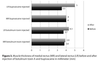 Ultrasonography showed an average increase in thickness of the muscle injected with Bupivacaine on the 7th day of 0.43 mm. The mean increase of muscle thickness after 30 days injection of bupivacaine was equal of 1.01 mm, and after botulinum toxin A injection was equal of 0.28 mm. When comparing before and after injection, an increase in thickness of the LR injected with botulinum toxin A (0.6 mm) and with bupivacaine (1.5 mm) was observed in thickness for each group of muscles. There was no increase in thickness of the MR injected with bupivacaine, and a small increase in the botulinum toxin A MR injected group (0.1 mm).