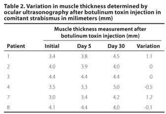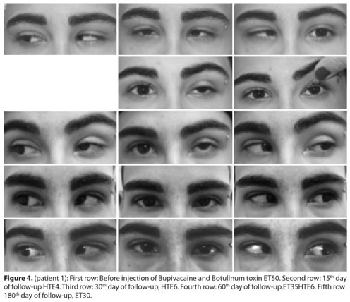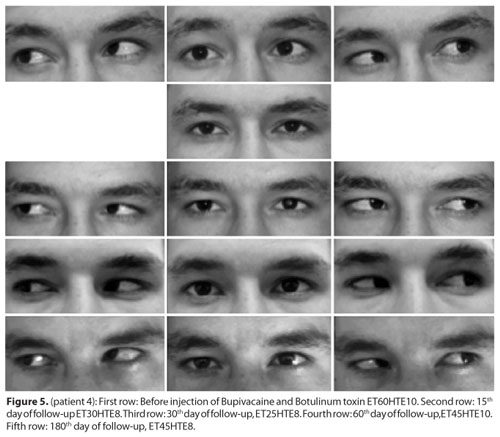We observed that patients 1, 3 and 4, who presented greater change in alignment, showed paresis of the two horizontal muscles (medial and lateral rectus) injected with medications during the regeneration period of the muscle. The same observation was stated in a previous study(14). All patients had the smallest deviation between 15 and 30 days after injection which is consistent with the peak of action of botulinum toxin A.