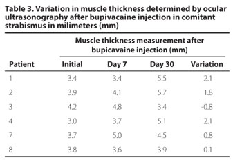 We observed greater technical difficulty in injecting bupivacaine into the medial rectus vs. the lateral rectus. This might have influenced the result in patient 5, who presented a complication of the procedure - retrobulbar hemorrhage; that resulted in an abnormal pupil but no deterioration in vision. Thus far, considering complications arising after the application of intramuscular bupivacaine, a previous study reported a case of orbital inflammation, which spontaneously resolved(4).