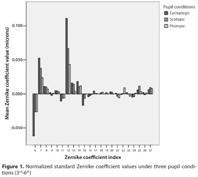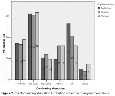 análise de frentes de ondas, evitando erros de medição consequentes à mudança de centroide pupilar provocada por midriáticos. A dilatação farmacológica da pupila induziu aumento dos coeficientes de Zernike Z3-3, Z40 e Z5-5. As aberrações de mais alta ordem (terceira, quarta, quinta e sexta ordem) e a aberração esférica aumentaram de forma estatisticamente significativa, em comparação com a condição escotópica (P<0,010). Quando a condição escotópica se mudou para a condição fotópica, os coeficientes de Zernike Z40, Z42, Z6-4, Z6-2, Z62 e todas as aberrações de alta ordem diminuíram de forma estatisticamente significativa (P<0,010), demonstrando que a miose acomodativa pode significativamente melhorar a visão sob a condição fotópica. Sob as três condições, a aberração coma vertical apareceu mais frequentemente dentro das aberrações dominantes, sem influência significativa da variação do tamanho da pupila, e a proporção de aberração esférica diminuiu com a diminuição do tamanho da pupila.
