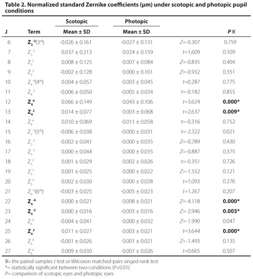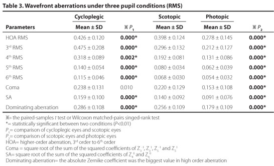 SPSS (version 13.0) (SPSS Inc, Chicago, IL, USA) was used. The pupil diameter, standard Zernike coefficients, root mean square (RMS) of higher-order aberrations and dominant aberrations were compared between cycloplegic and scotopic conditions, and between scotopic and photopic conditions. For measurement differences with normal distribution, paired t-test was used for comparison; for measurement differences with abnormal distribution, Wilcoxon signed ranks test was used for comparison. A statistically significant difference was considered if P was <0.010.
