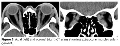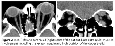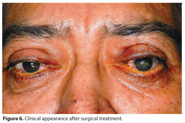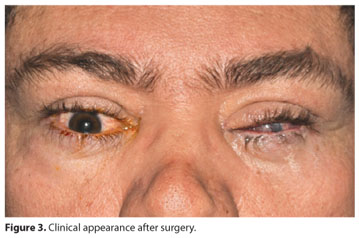 On examination, the left eye was subluxated with its corneal surface covered by a thick white fibrinous membrane. (Figure 1). Visual acuity was 20/200 in the right eye and light perception in the left eye. Marked hyperemia, chemosis and keratopathy were evident in the right eye. Elevation was limited in the right eye. The left eye was frozen and its anterior segment was impossible to examine due to the conditions of the eye surface. The left eye was anesthetized and profusely irrigated with saline solution. The cornea then became visible, showing a white opacity consistent with incipient corneal melting. Exophthalmometry was estimated with a millimeter ruler to be 23 mm in the right and 39 mm in the left. Globe repositioning with manual maneuvers, cantholysis and Frost suture placement was unsuccessful. Orbital CT scans revealed a significant enlargement of the left EOM (Figure 2). On the same day, the patient underwent a simultaneous orbital decompression and bilateral blepharotomy combined with Müllerectomy plus recession of the levator muscle. Both orbits were inferomedially decompressed. The medial wall was accessed through the upper lid incision(12). The floor was operated by a conventional transconjunctival approach. Postoperatively, the left eye was repositioned. The globe protrusion decreased 4 mm in the right eye and 19 mm in the left eye. His visual acuity improved to 20/40 in the right eye and remained light perception in the left. Four months after surgery the patient was treated with radiotherapy in both orbits and conjunctival coverage of the left cornea. A right reverse lower eyelid ptosis was corrected by shortening the lid retractors through an anterior approach. He is now stable (Figure 3).